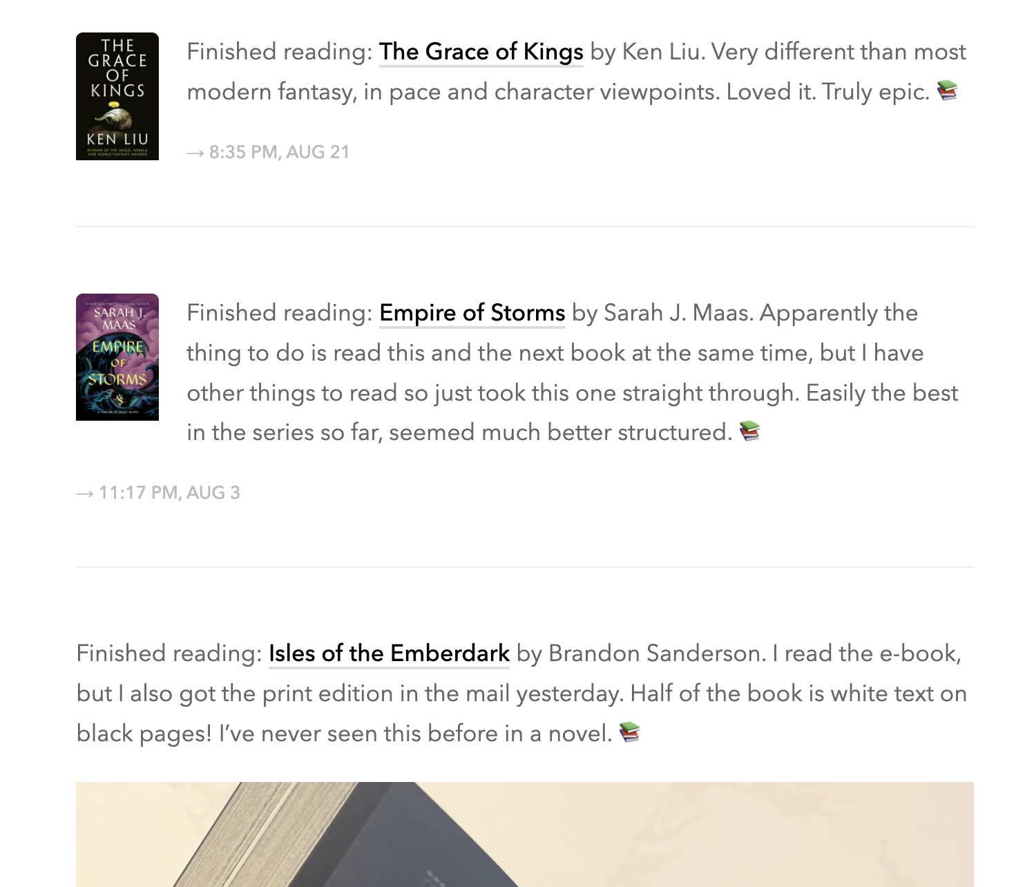 Over the summer we started including little book cover previews on the Micro.blog timeline when a book is mentioned. People loved this, and of course wanted it on their own blog too. That is starting to roll out now.